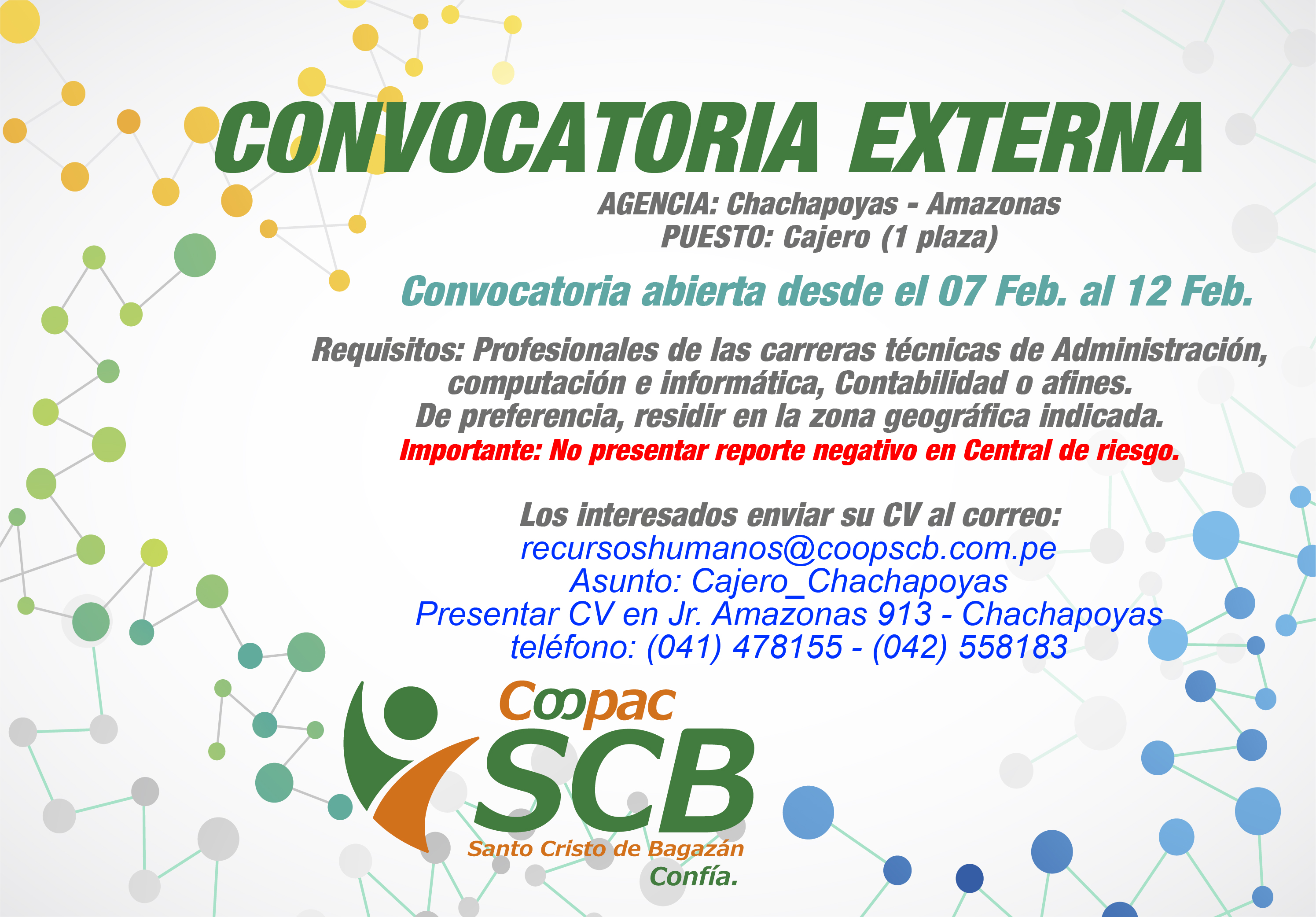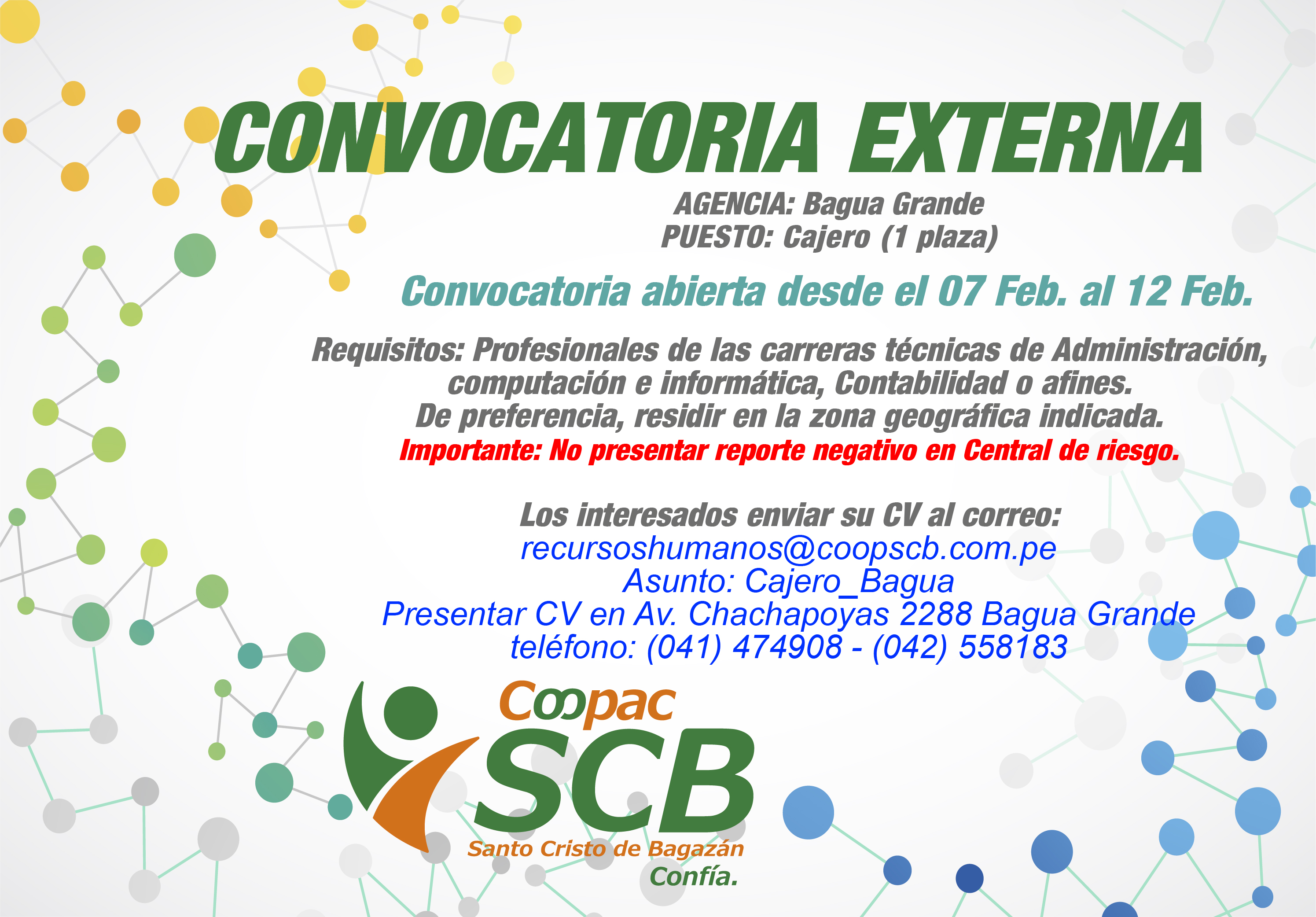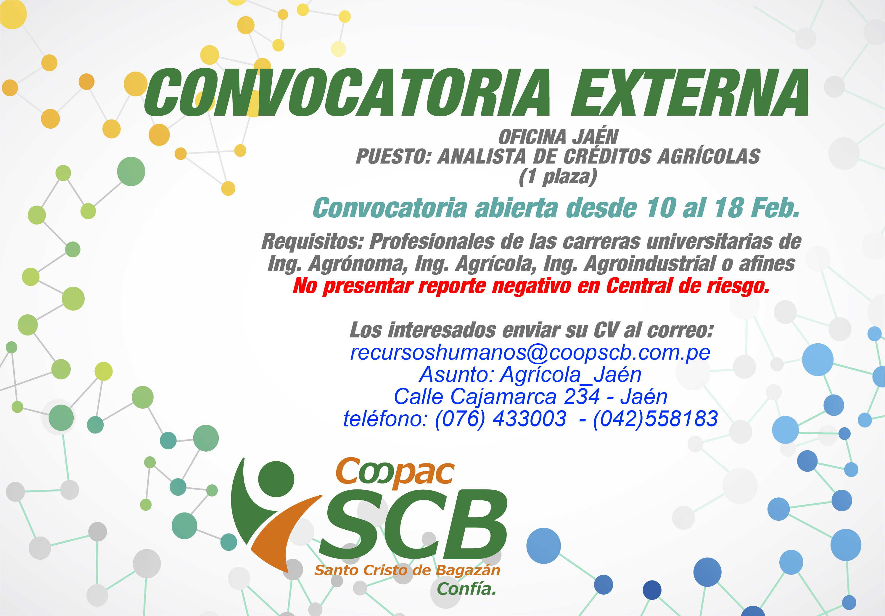 La Cooperativa Santo Cristo de Bagazán, se encuentra en búsqueda del mejor talento para incorporar a nuestro equipo de trabajo en la sede Nueva Cajamarca.PUESTO: ANALISTA DE CRÉDITOS AGRÍCOLAS (1 Plaza) Perfil Profesional:Profesionales de las carreras universitarias de Ing. Agrónoma, Ing. Agrícola, Ing. Agroindustrial o afines.